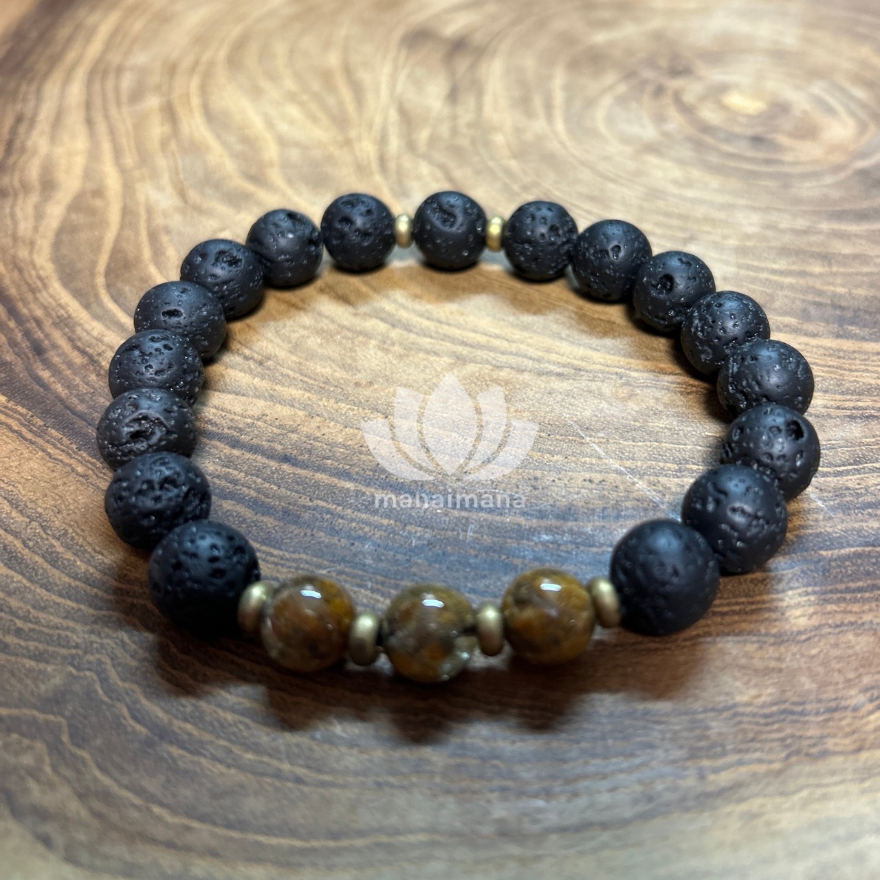 溶岩石の大地に根差す力強いエネルギーと、菊花タイチンルチルの華やかな成功運・金運が融合し、「足元を固めて、上昇する」パワーを持つブレスレットです。真鍮ビーズが程よい温もりとバランスを加え、心身ともに安定した上での前進を促します。